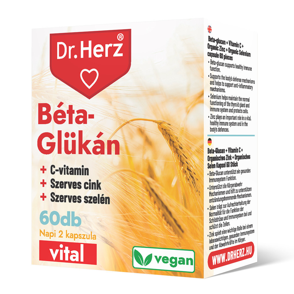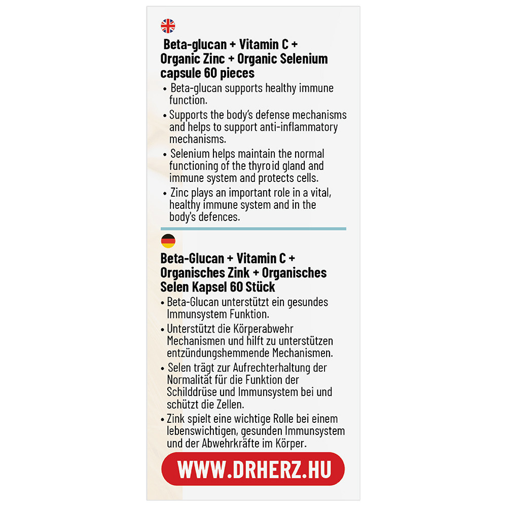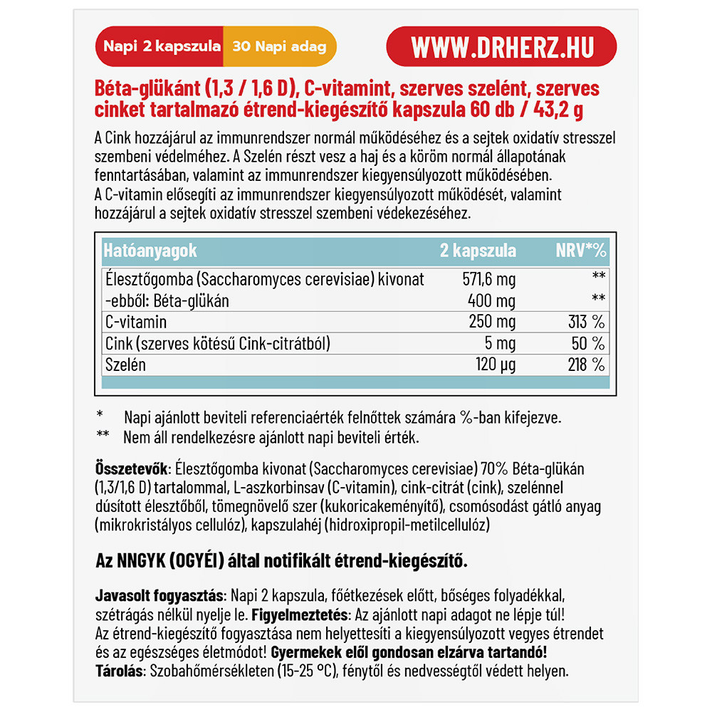 Összetevők: élesztő gomba kivonat (Saccharomyces cerevisiae) 70% Béta-glükán (1,3/1,6 D) tartalommal, L-aszkorbinsav (C-vitamin), cink-citrát (cink), szelénnel dúsított élesztőből, tömegnövelő szer (kukoricakeményítő), csomósodást gátló anyag (mikrokristályos cellulóz), kapszulahéj (hidroxipropil-metilcellulóz)