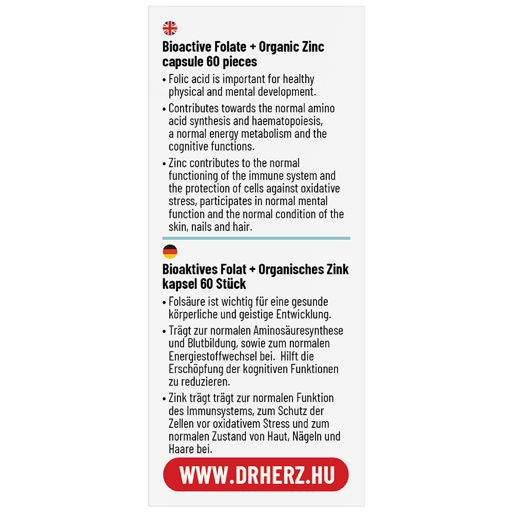 Összetevők: cink (cink-citrát), folsav (kalcium-L-metil-folát), tömegnövelő szer (kukoricakeményítő), csomósodást gátló anyag (mikrokristályos cellulóz), kapszulahéj (hidroxipropil-metilcellulóz)