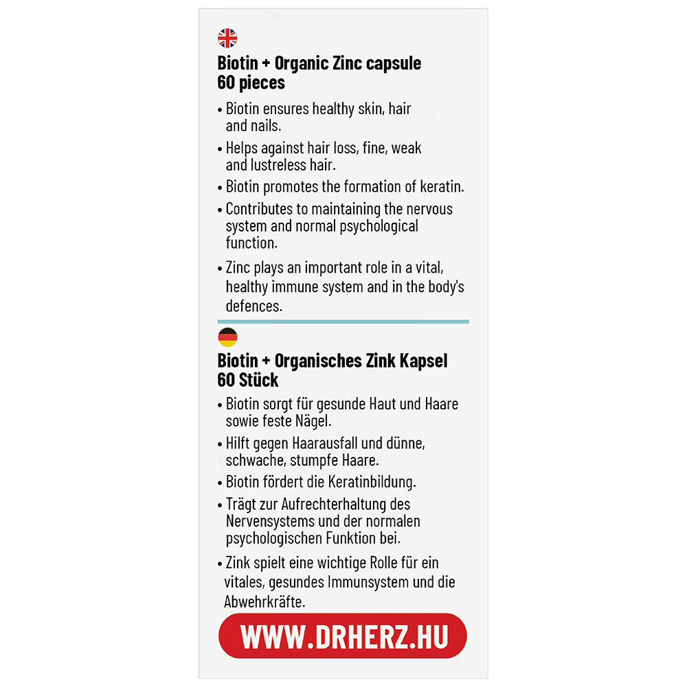 Összetevők: D-biotin (biotin), cink (cink- citrát), tömegnövelő szer (kukoricakeményítő), csomósodást gátló anyag (mikrokristályos cellulóz), kapszulahéj hidroxipropil-metil-cellulóz