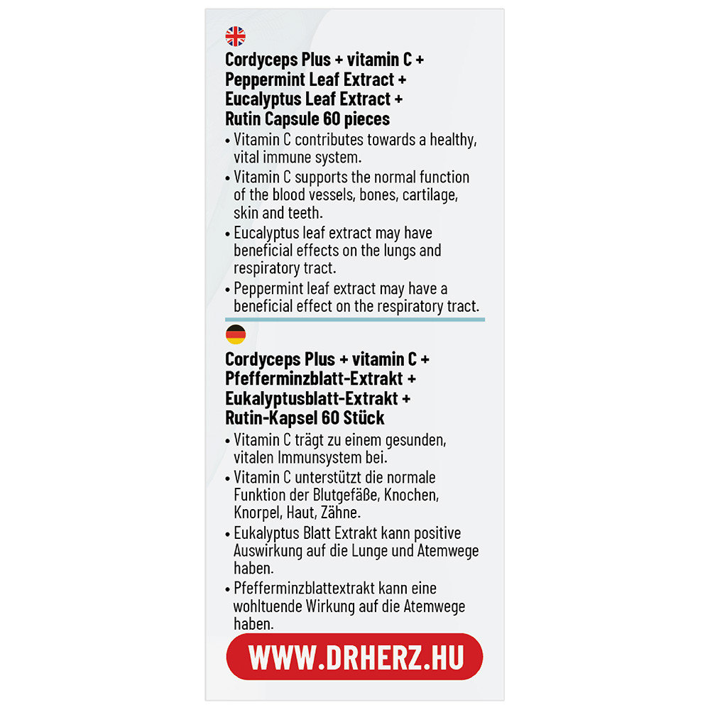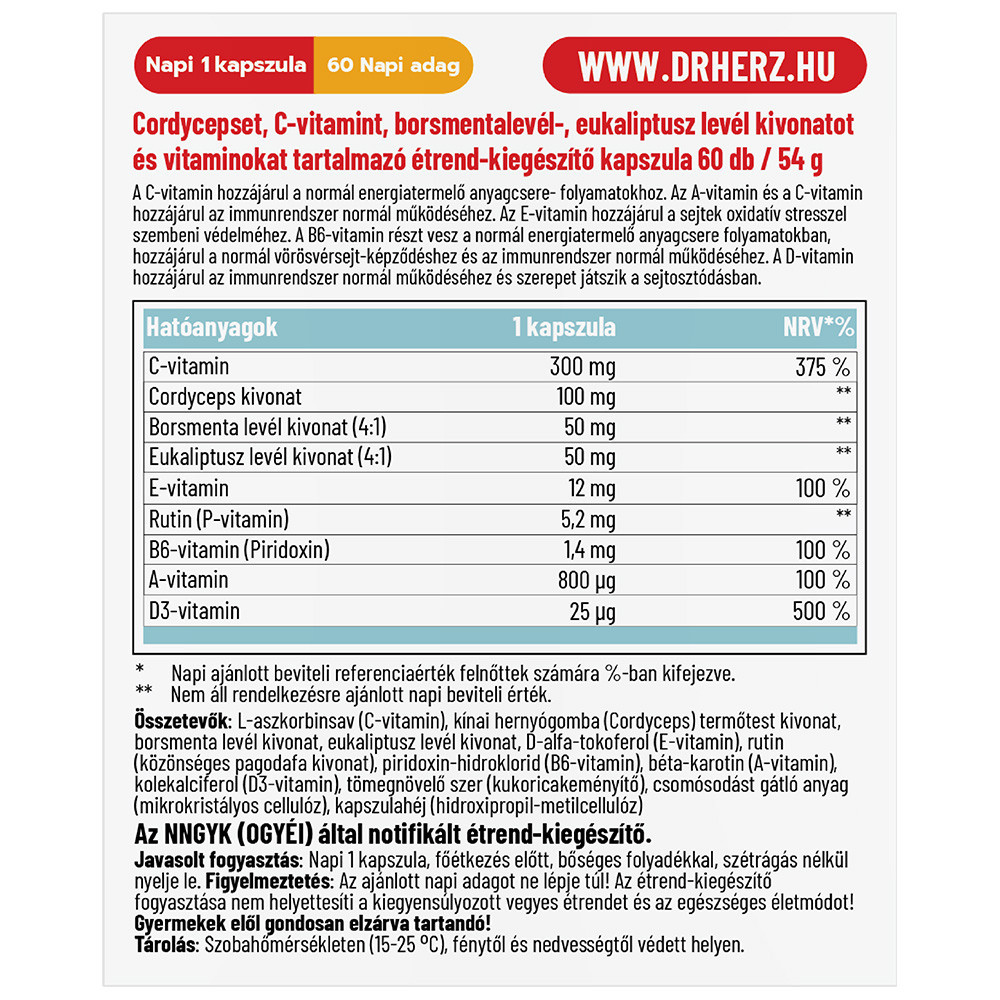 ÖSSZETEVŐK:L-aszkorbinsav (C-vitamin), kínai hernyógomba (Cordyceps) termőtest kivonat, borsmenta levél kivonat, eukaliptusz levél kivonat, D-alfa-tokoferol (E-vitamin), rutin (közönséges pagodafa kivonat), piridoxin-hidroklorid (B6-vitamin), béta-karotin (A-vitamin), kolekalciferol (D3-vitamin), tömegnövelő szer (kukoricakeményítő), csomósodást gátló anyag (mikrokristályos cellulóz), kapszulahéj (hidroxipropil-metilcellulóz)