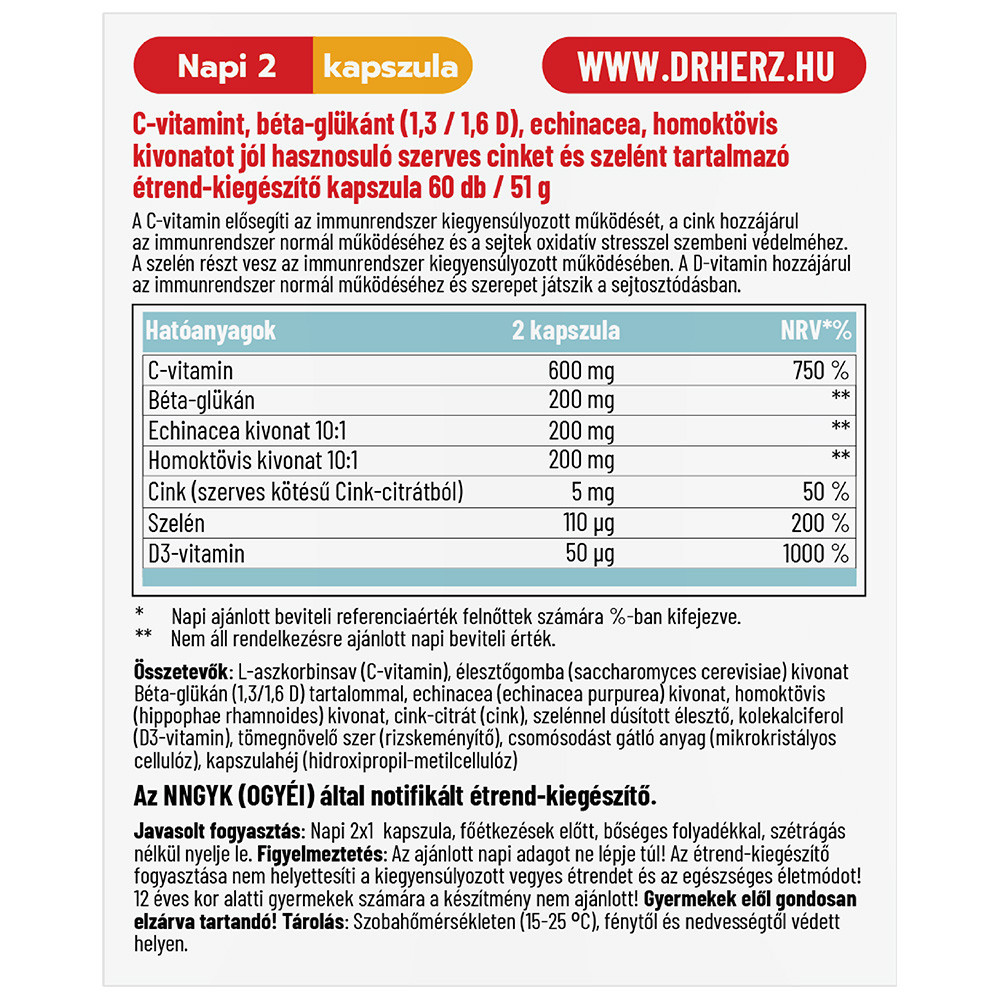 Összetevők: L-aszkorbinsav (C-vitamin), élesztőgomba (Saccharomyces cerevisiae) kivonat Béta-glükán (1,3 /1,6 D) tartalommal, Echinacea (Echinacea purpurea) kivonat, Homoktövis (Hippophae rhamnoides) kivonat, cink-citrát (cink), szelénnel dúsított élesztő, kolekalciferol (D3-vitamin), tömegnövelő szer (kukoricakeményítő), csomósodást gátló anyag (mikrokristályos cellulóz), kapszulahéj hidroxipropil-metil-cellulóz