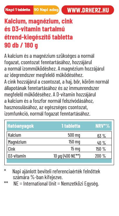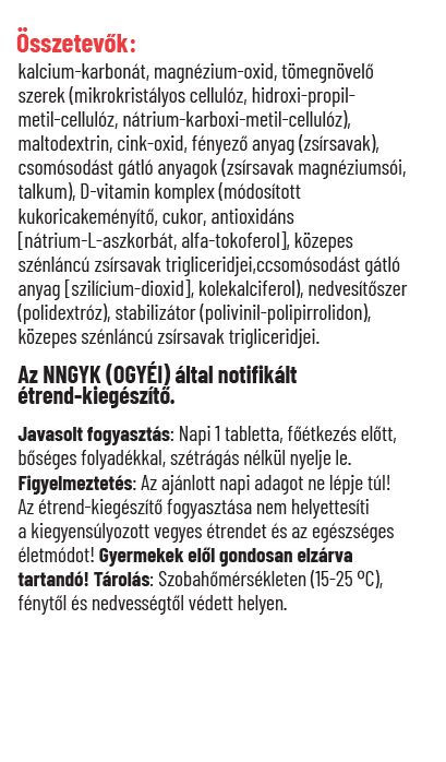 Összetevők: Kalcium-karbonát, magnézium-oxid, tömegnövelő szerek (mikrokristályos cellulóz, hidroxipropil-metil-cellulóz, nátrium- karboxi-metil-cellulóz), maltodextrin, cink-oxid,fényező anyag (zsírsavak), csomósodást gátlók (zsírsavak magnéziumsói), színezék (vas-oxid, talkum), D-vitamin komplex (módosított kukoricakeményítő, cukor, antioxidáns [nátrium -L-aszkorbát, alfa-tokoferol], közepes szénláncú zsírsavak trigliceridjei, csomósodást gátló [szilícium-dioxid], kolekalciferol), nedvesítőszer (polidextróz), stabilizátor (polivinil-polipirrolidon), közepes szénláncú zsírsavak trigliceridjei