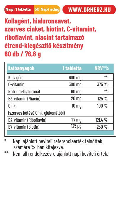 A kollagén egy vízmegkötő tulajdonságú összetett fehérje, a bőr struktúrájának nélkülözhetetlen vázanyaga. A hyaluronsav a porcok építőanyaga. E készítmény a szervezet számára könnyen hasznosuló kollagén és hyaluronsav mellett C-vitamint is tartalmaz, mely hozzájárul a megfelelő kollagén képződéshez és ezen keresztül a bőr normál állapotának, működésének fenntartásához. A hozzáadott jól hasznosuló szerves cink hozzájárul a haj, bőr és köröm normál állapotának fenntartásához.