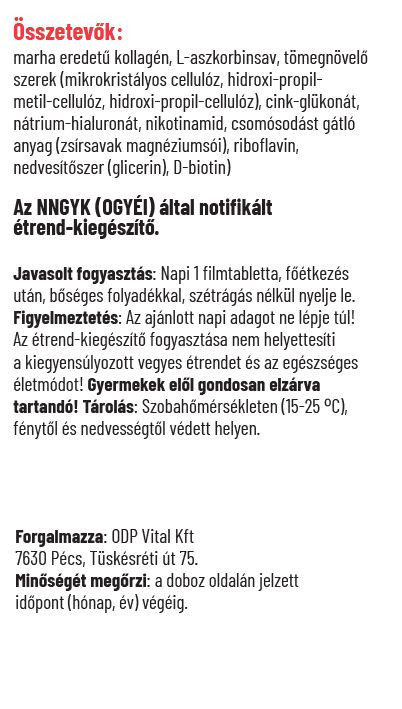 Összetevők: marhaeredetű kollagén (Peptan®), L-aszkorbinsav, tömegnövelő szerek (mikrokristályos cellulóz, hidroxi-propil-metil-cellulóz), cink-glükonát, nátrium-hialuronát, nikotinamid (B3-vitamin), csomósodást gátló anyagok (zsírsavak magnéziumsói, talkum), színezék (vas-oxidok és vas-hidroxidok), nedvesítőszer (polidextróz), riboflavin (B2-vitamin), D-biotin (B7-vitamin), közepes szénláncú zsírsavak trigliceridjei, kókuszolaj.