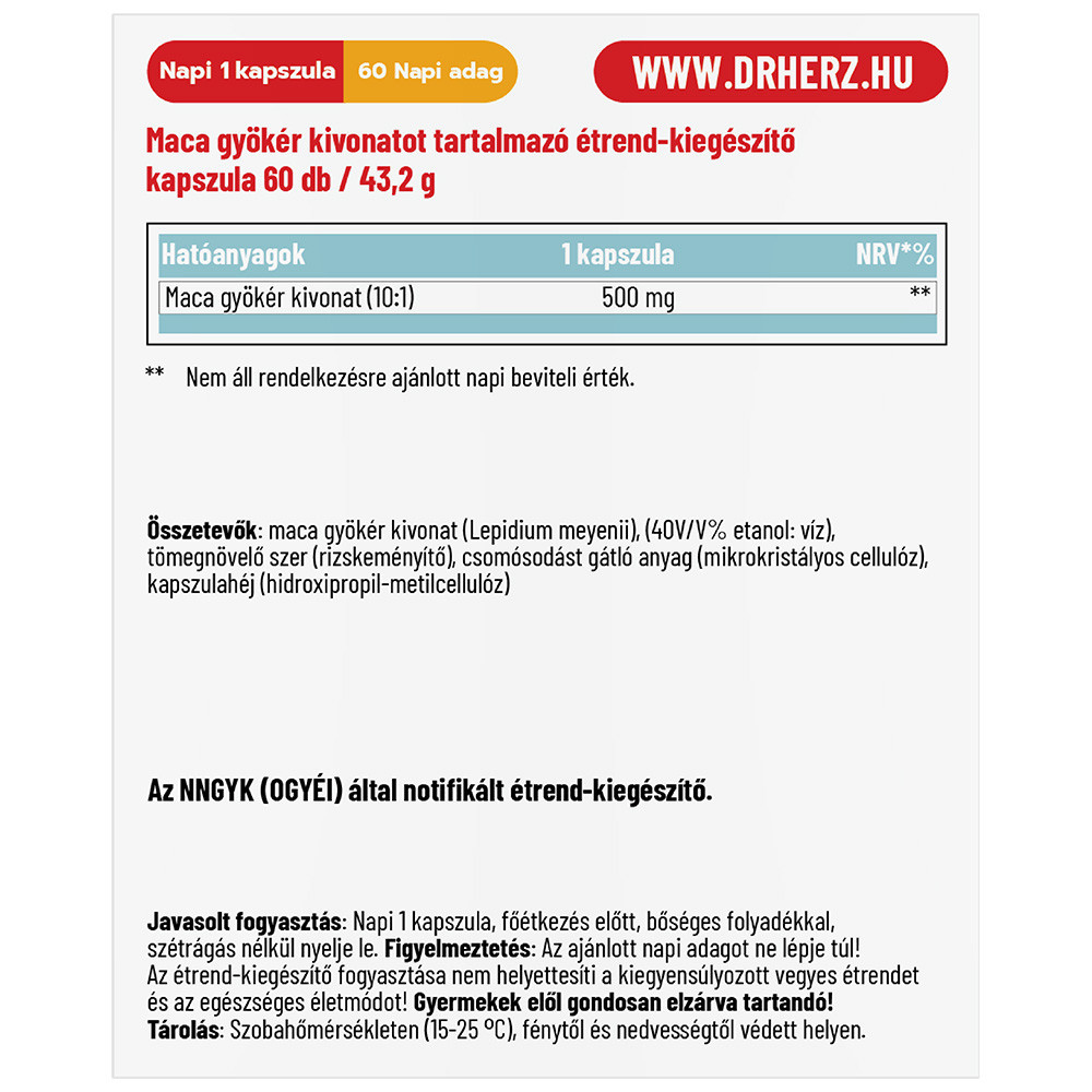 Összetevők: maca gyökér kivonat (Lepidium meyenii), (40V/V% etanol: víz), tömegnövelő szer (rizskeményítő), csomósodást gátló anyag (mikrokristályos cellulóz), kapszulahéj (hidroxipropil-metilcellulóz)