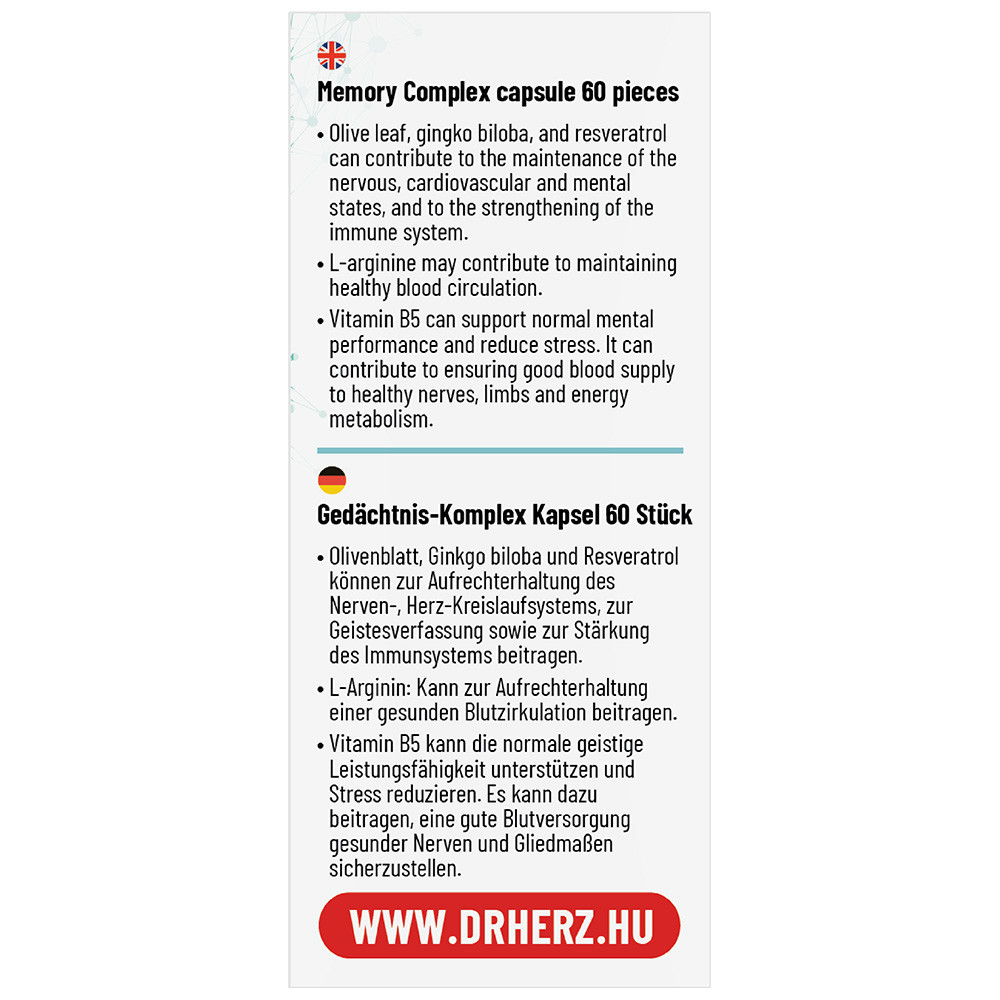 Összetétel: olajfalevél őrlemény por (olea europaea), L-arginin-hidroklorid (L-arginin-HCL), ginkgo biloba (páfrányfenyő) levél kivonat, transz-resveratrol, kalcium-D-pantotenát (B5-vitamin), tömegnövelő szer (rizskeményítő), csomósodást gátló anyag (mikrokristályos cellulóz), kapszulahéj hidroxipropil-metil-cellulóz