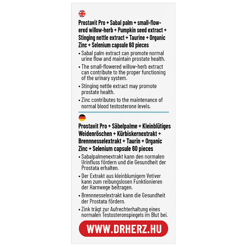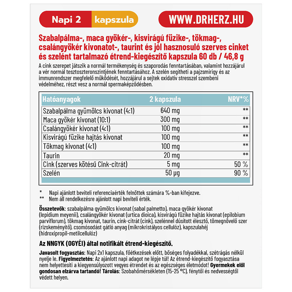 Összetevők: szabalpálma gyümölcs kivonat (sabal palmetto), maca gyökér kivonat (lepidium meyenii),kisvirágú füzike hajtás kivonat (epilobium parviflorum), tökmag kivonat, taurin, cink-citrát (cink),szelénnel dúsított élesztő, tömegnövelő szer (kukoricakeményítő), csomósodást gátló anyag (mikrokristályos cellulóz), kapszulahéj hidroxipropil-metil-cellulóz