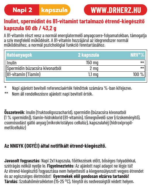 Összetevők: inulin (fruktooligoszacharid), spermidin (búzacsíra kivonatból(1 % spermidin)), tiamin-hidroklorid (B1-vitamin), tömegnövelő szer (rizskeményítő), csomósodást gátló anyag (mikrokristályos cellulóz), kapszulahéj (hidroxipropilmetilcellulóz)