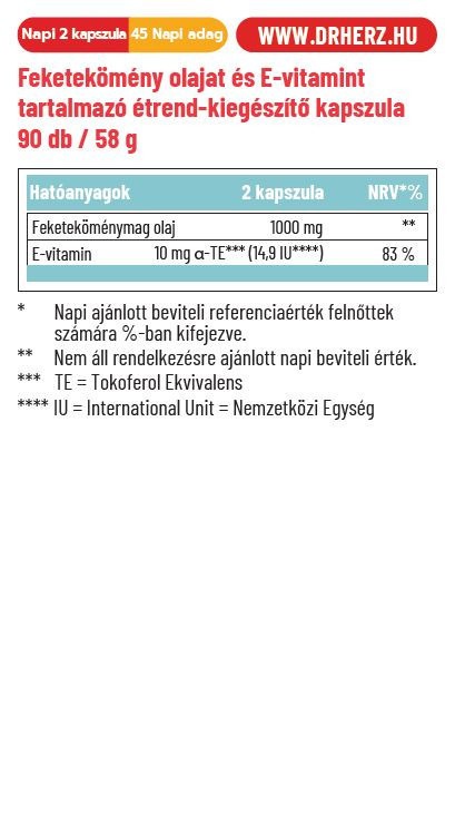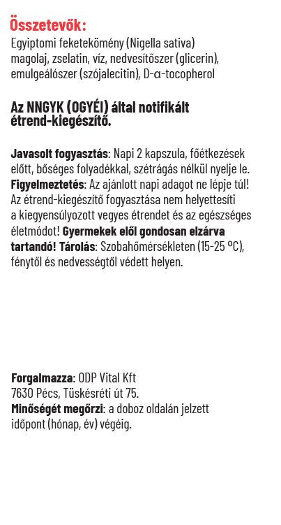 Összetevők: egyiptomi feketekömény olaj (Nigella sativa), kapszulahéj: zselatin, nedvesítőszer: glicerin, víz, emulgeálószer (szójalecitin)