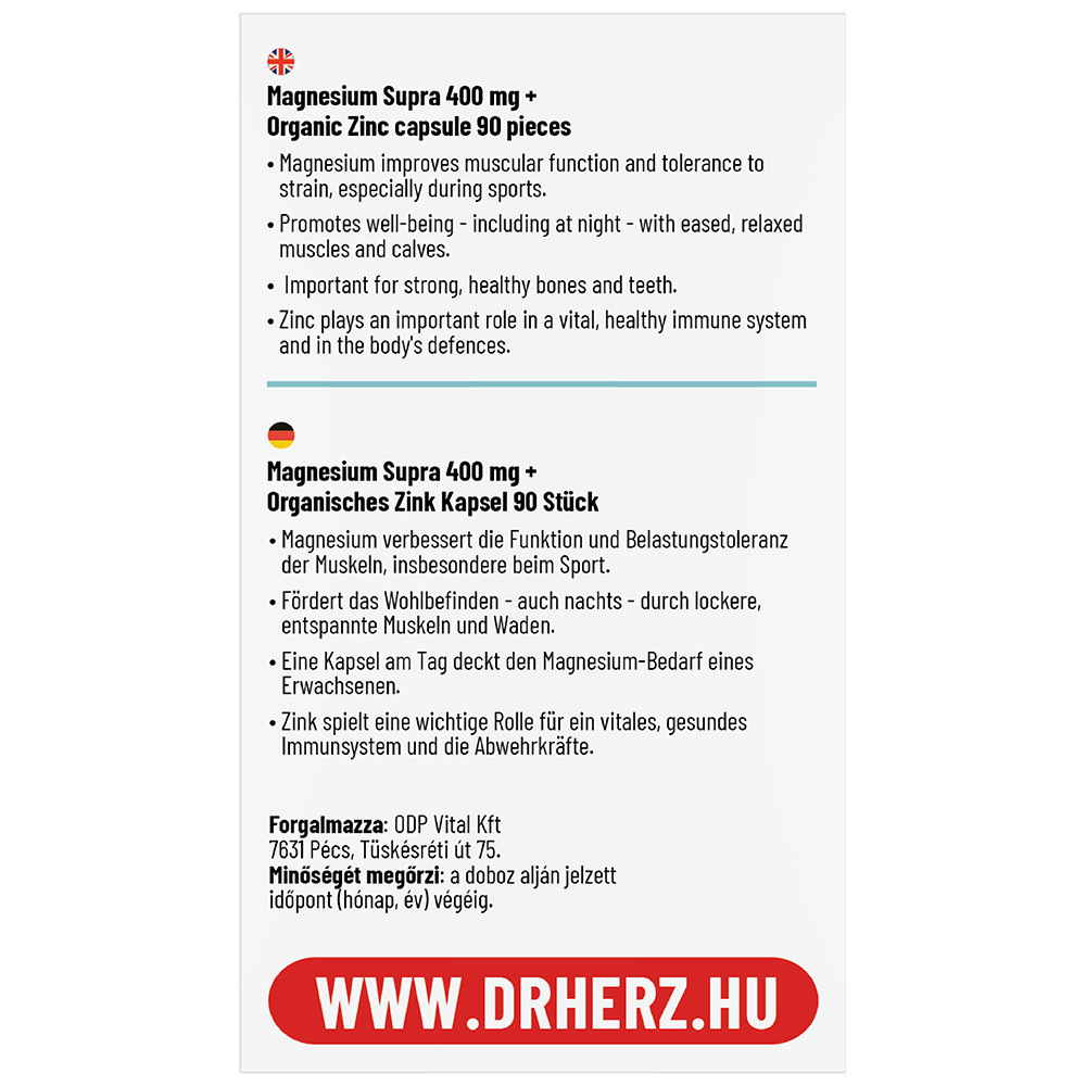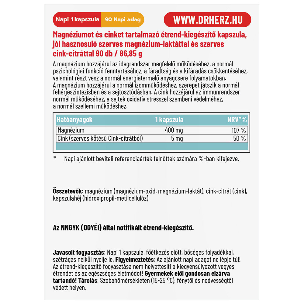Összetevők: magnézium-oxid, magnézium laktát (magnézium), cink-citrát (cink), tömegnövelő szer (kukoricakeményítő), csomósodást gátló anyag (zsírsavak magnéziumsói), kapszulahéj hidroxipropil-metil-cellulóz